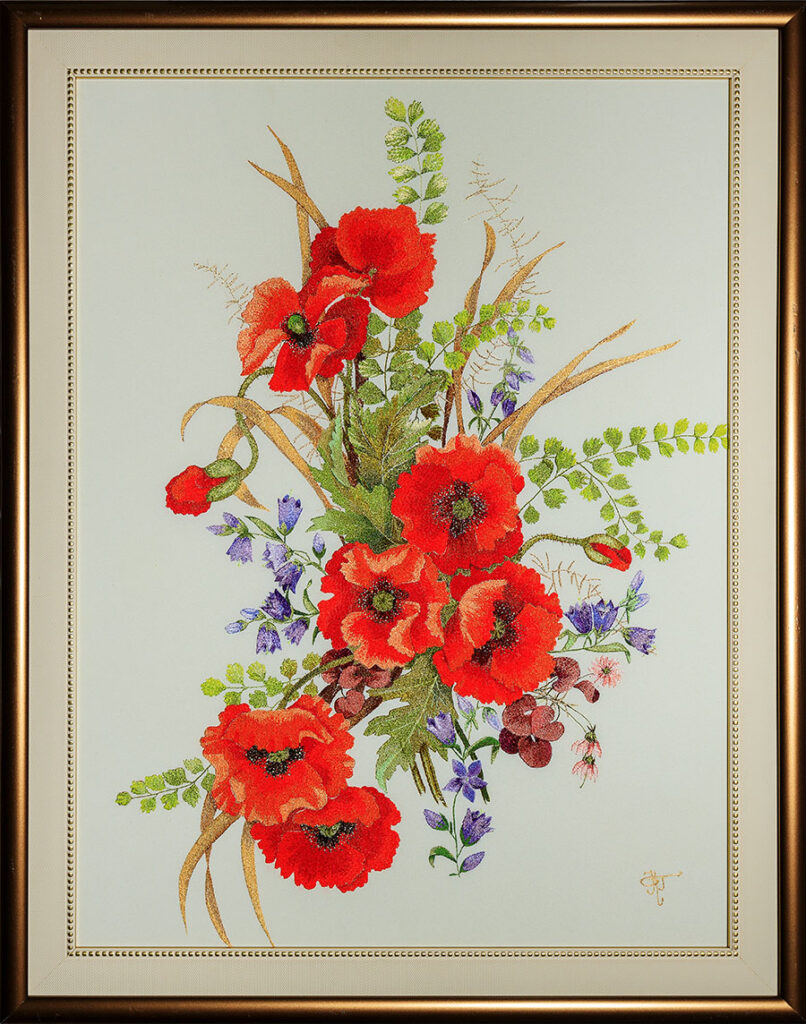 “СПАЛАХ” (Nadiia Holovachuk), 65 х 55 см. Авторська художня гладь, ручна робота, шовк, ДМС, муліне, габардин.